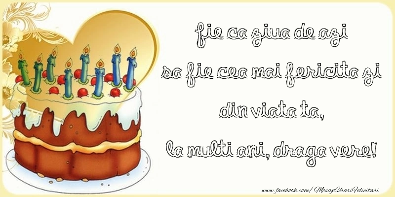 Această imagine de zi de nastere cu desen cu tort și inimioară are dimensiunile 800px x 400px și textul Fie ca ziua de azi sa fie cea mai fericita zi din viata ta, draga vere.