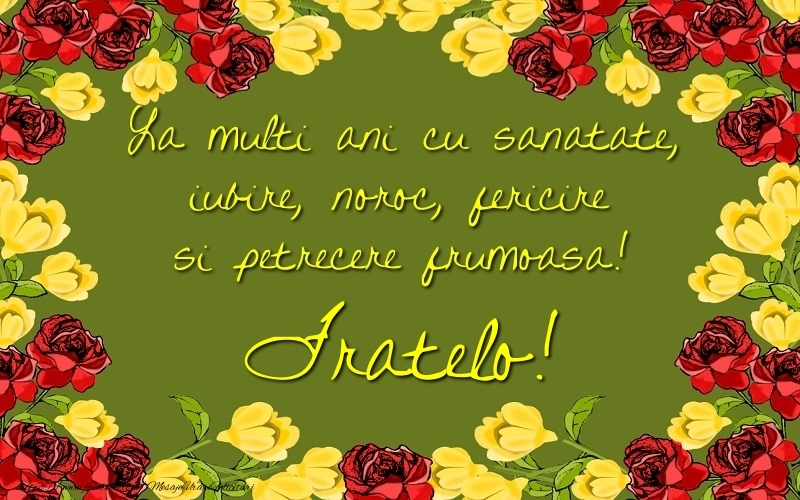 Această imagine de la multi ani cu chenar din trandafiri roșii și galbeni are dimensiunile 800px x 500px și textul La multi ani cu sanatate, iubire, noroc, fericire si petrecere frumoasa! fratelo.