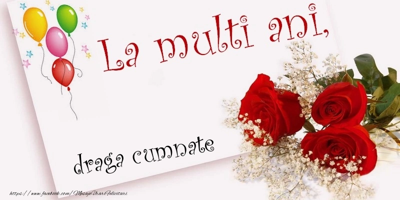 Această imagine de la multi ani cu 3 trandafiri și baloane colorate are dimensiunile 800px x 400px și textul La multi ani, draga cumnate.