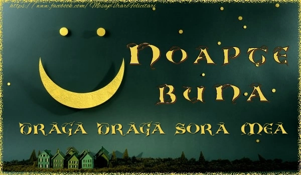 Această imagine de noapte buna cu peisaj cu lună și stele care zâmbesc are dimensiunile 600px x 350px și textul Noapte buna draga sora mea.