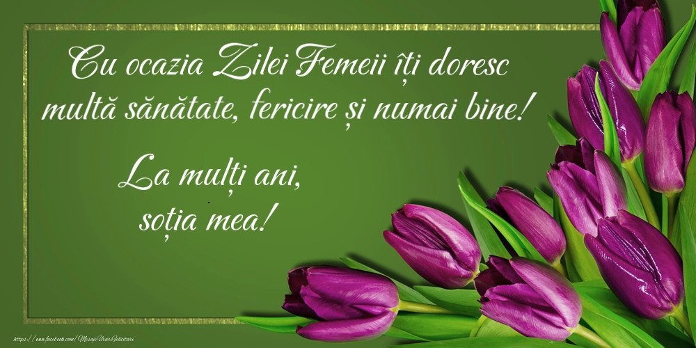 Alegeți să dăruiți o felicitare de neuitat în această zi de 8 Martie cu această felicitare cu lalele mov pe fundal verde special creată pentru soția ta!
