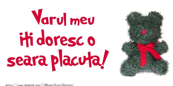 Această imagine de buna seara cu ursuleț de pluș are dimensiunile 600px x 300px și textul Varul meu iti doresc o seara placuta!.